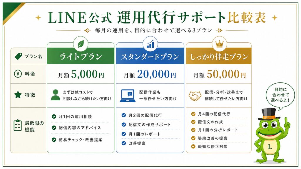 その後の運用も希望される方には、アドバイスから配信代行まで選べる運用代行プランをご用意しています。